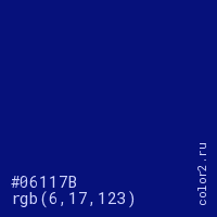 Цвет #06117B в цветовой модели RGB обозначается тремя октетами (6, 17, 123) в десятичном формате и #06117B в шестнадцатиричном (hex) формате, которые являются интенсивностью красного 6 (hex 06), интенсивность зелёного 17 (hex 11) и интенсивность синего 123 (hex 7B).