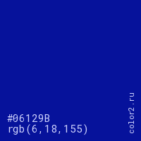 Цвет #06129B в цветовой модели RGB обозначается тремя октетами (6, 18, 155) в десятичном формате и #06129B в шестнадцатиричном (hex) формате, которые являются интенсивностью красного 6 (hex 06), интенсивность зелёного 18 (hex 12) и интенсивность синего 155 (hex 9B).