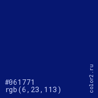 Цвет #061771 в цветовой модели RGB обозначается тремя октетами (6, 23, 113) в десятичном формате и #061771 в шестнадцатиричном (hex) формате, которые являются интенсивностью красного 6 (hex 06), интенсивность зелёного 23 (hex 17) и интенсивность синего 113 (hex 71).