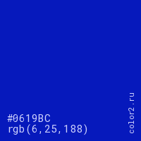 Цвет #0619BC в цветовой модели RGB обозначается тремя октетами (6, 25, 188) в десятичном формате и #0619BC в шестнадцатиричном (hex) формате, которые являются интенсивностью красного 6 (hex 06), интенсивность зелёного 25 (hex 19) и интенсивность синего 188 (hex BC).
