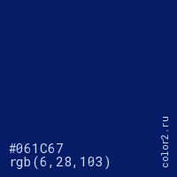 Цвет #061C67 в цветовой модели RGB обозначается тремя октетами (6, 28, 103) в десятичном формате и #061C67 в шестнадцатиричном (hex) формате, которые являются интенсивностью красного 6 (hex 06), интенсивность зелёного 28 (hex 1C) и интенсивность синего 103 (hex 67).