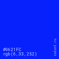 Цвет #0621FC в цветовой модели RGB обозначается тремя октетами (6, 33, 252) в десятичном формате и #0621FC в шестнадцатиричном (hex) формате, которые являются интенсивностью красного 6 (hex 06), интенсивность зелёного 33 (hex 21) и интенсивность синего 252 (hex FC).
