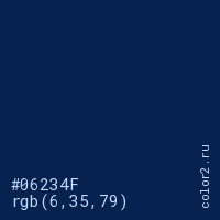 Цвет #06234F в цветовой модели RGB обозначается тремя октетами (6, 35, 79) в десятичном формате и #06234F в шестнадцатиричном (hex) формате, которые являются интенсивностью красного 6 (hex 06), интенсивность зелёного 35 (hex 23) и интенсивность синего 79 (hex 4F).