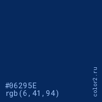 Цвет #06295E в цветовой модели RGB обозначается тремя октетами (6, 41, 94) в десятичном формате и #06295E в шестнадцатиричном (hex) формате, которые являются интенсивностью красного 6 (hex 06), интенсивность зелёного 41 (hex 29) и интенсивность синего 94 (hex 5E).