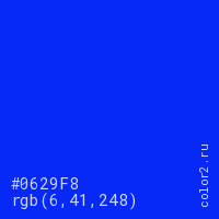 Цвет #0629F8 в цветовой модели RGB обозначается тремя октетами (6, 41, 248) в десятичном формате и #0629F8 в шестнадцатиричном (hex) формате, которые являются интенсивностью красного 6 (hex 06), интенсивность зелёного 41 (hex 29) и интенсивность синего 248 (hex F8).