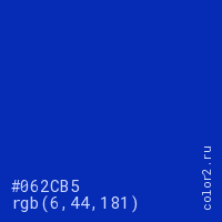 Цвет #062CB5 в цветовой модели RGB обозначается тремя октетами (6, 44, 181) в десятичном формате и #062CB5 в шестнадцатиричном (hex) формате, которые являются интенсивностью красного 6 (hex 06), интенсивность зелёного 44 (hex 2C) и интенсивность синего 181 (hex B5).