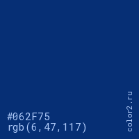 Цвет #062F75 в цветовой модели RGB обозначается тремя октетами (6, 47, 117) в десятичном формате и #062F75 в шестнадцатиричном (hex) формате, которые являются интенсивностью красного 6 (hex 06), интенсивность зелёного 47 (hex 2F) и интенсивность синего 117 (hex 75).