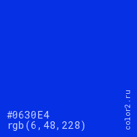 Цвет #0630E4 в цветовой модели RGB обозначается тремя октетами (6, 48, 228) в десятичном формате и #0630E4 в шестнадцатиричном (hex) формате, которые являются интенсивностью красного 6 (hex 06), интенсивность зелёного 48 (hex 30) и интенсивность синего 228 (hex E4).