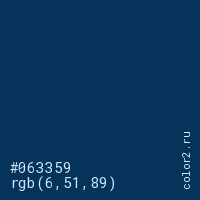 Цвет #063359 в цветовой модели RGB обозначается тремя октетами (6, 51, 89) в десятичном формате и #063359 в шестнадцатиричном (hex) формате, которые являются интенсивностью красного 6 (hex 06), интенсивность зелёного 51 (hex 33) и интенсивность синего 89 (hex 59).