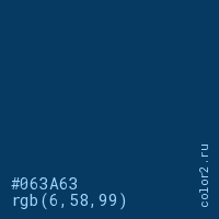 Цвет #063A63 в цветовой модели RGB обозначается тремя октетами (6, 58, 99) в десятичном формате и #063A63 в шестнадцатиричном (hex) формате, которые являются интенсивностью красного 6 (hex 06), интенсивность зелёного 58 (hex 3A) и интенсивность синего 99 (hex 63).