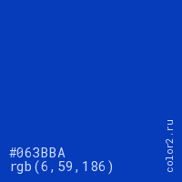Цвет #063BBA в цветовой модели RGB обозначается тремя октетами (6, 59, 186) в десятичном формате и #063BBA в шестнадцатиричном (hex) формате, которые являются интенсивностью красного 6 (hex 06), интенсивность зелёного 59 (hex 3B) и интенсивность синего 186 (hex BA).