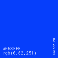 Цвет #063EFB в цветовой модели RGB обозначается тремя октетами (6, 62, 251) в десятичном формате и #063EFB в шестнадцатиричном (hex) формате, которые являются интенсивностью красного 6 (hex 06), интенсивность зелёного 62 (hex 3E) и интенсивность синего 251 (hex FB).