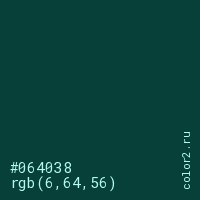 Цвет #064038 в цветовой модели RGB обозначается тремя октетами (6, 64, 56) в десятичном формате и #064038 в шестнадцатиричном (hex) формате, которые являются интенсивностью красного 6 (hex 06), интенсивность зелёного 64 (hex 40) и интенсивность синего 56 (hex 38).