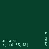 Цвет #06412B в цветовой модели RGB обозначается тремя октетами (6, 65, 43) в десятичном формате и #06412B в шестнадцатиричном (hex) формате, которые являются интенсивностью красного 6 (hex 06), интенсивность зелёного 65 (hex 41) и интенсивность синего 43 (hex 2B).