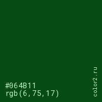 Цвет #064B11 в цветовой модели RGB обозначается тремя октетами (6, 75, 17) в десятичном формате и #064B11 в шестнадцатиричном (hex) формате, которые являются интенсивностью красного 6 (hex 06), интенсивность зелёного 75 (hex 4B) и интенсивность синего 17 (hex 11).