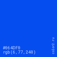 Цвет #064DF0 в цветовой модели RGB обозначается тремя октетами (6, 77, 240) в десятичном формате и #064DF0 в шестнадцатиричном (hex) формате, которые являются интенсивностью красного 6 (hex 06), интенсивность зелёного 77 (hex 4D) и интенсивность синего 240 (hex F0).