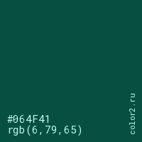 Цвет #064F41 в цветовой модели RGB обозначается тремя октетами (6, 79, 65) в десятичном формате и #064F41 в шестнадцатиричном (hex) формате, которые являются интенсивностью красного 6 (hex 06), интенсивность зелёного 79 (hex 4F) и интенсивность синего 65 (hex 41).