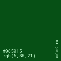 Цвет #065015 в цветовой модели RGB обозначается тремя октетами (6, 80, 21) в десятичном формате и #065015 в шестнадцатиричном (hex) формате, которые являются интенсивностью красного 6 (hex 06), интенсивность зелёного 80 (hex 50) и интенсивность синего 21 (hex 15).