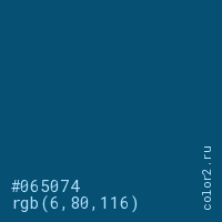 Цвет #065074 в цветовой модели RGB обозначается тремя октетами (6, 80, 116) в десятичном формате и #065074 в шестнадцатиричном (hex) формате, которые являются интенсивностью красного 6 (hex 06), интенсивность зелёного 80 (hex 50) и интенсивность синего 116 (hex 74).