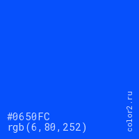 Цвет #0650FC в цветовой модели RGB обозначается тремя октетами (6, 80, 252) в десятичном формате и #0650FC в шестнадцатиричном (hex) формате, которые являются интенсивностью красного 6 (hex 06), интенсивность зелёного 80 (hex 50) и интенсивность синего 252 (hex FC).