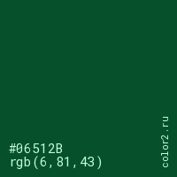Цвет #06512B в цветовой модели RGB обозначается тремя октетами (6, 81, 43) в десятичном формате и #06512B в шестнадцатиричном (hex) формате, которые являются интенсивностью красного 6 (hex 06), интенсивность зелёного 81 (hex 51) и интенсивность синего 43 (hex 2B).