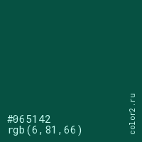 Цвет #065142 в цветовой модели RGB обозначается тремя октетами (6, 81, 66) в десятичном формате и #065142 в шестнадцатиричном (hex) формате, которые являются интенсивностью красного 6 (hex 06), интенсивность зелёного 81 (hex 51) и интенсивность синего 66 (hex 42).