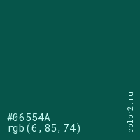 Цвет #06554A в цветовой модели RGB обозначается тремя октетами (6, 85, 74) в десятичном формате и #06554A в шестнадцатиричном (hex) формате, которые являются интенсивностью красного 6 (hex 06), интенсивность зелёного 85 (hex 55) и интенсивность синего 74 (hex 4A).