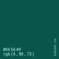 Цвет #065649 в цветовой модели RGB обозначается тремя октетами (6, 86, 73) в десятичном формате и #065649 в шестнадцатиричном (hex) формате, которые являются интенсивностью красного 6 (hex 06), интенсивность зелёного 86 (hex 56) и интенсивность синего 73 (hex 49).