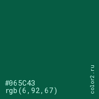 Цвет #065C43 в цветовой модели RGB обозначается тремя октетами (6, 92, 67) в десятичном формате и #065C43 в шестнадцатиричном (hex) формате, которые являются интенсивностью красного 6 (hex 06), интенсивность зелёного 92 (hex 5C) и интенсивность синего 67 (hex 43).