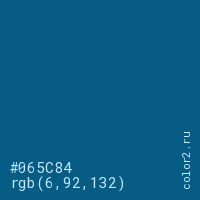 Цвет #065C84 в цветовой модели RGB обозначается тремя октетами (6, 92, 132) в десятичном формате и #065C84 в шестнадцатиричном (hex) формате, которые являются интенсивностью красного 6 (hex 06), интенсивность зелёного 92 (hex 5C) и интенсивность синего 132 (hex 84).