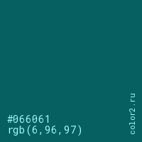 Цвет #066061 в цветовой модели RGB обозначается тремя октетами (6, 96, 97) в десятичном формате и #066061 в шестнадцатиричном (hex) формате, которые являются интенсивностью красного 6 (hex 06), интенсивность зелёного 96 (hex 60) и интенсивность синего 97 (hex 61).