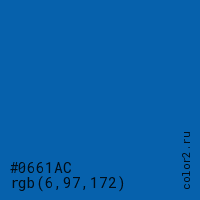 Цвет #0661AC в цветовой модели RGB обозначается тремя октетами (6, 97, 172) в десятичном формате и #0661AC в шестнадцатиричном (hex) формате, которые являются интенсивностью красного 6 (hex 06), интенсивность зелёного 97 (hex 61) и интенсивность синего 172 (hex AC).