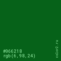 Цвет #066218 в цветовой модели RGB обозначается тремя октетами (6, 98, 24) в десятичном формате и #066218 в шестнадцатиричном (hex) формате, которые являются интенсивностью красного 6 (hex 06), интенсивность зелёного 98 (hex 62) и интенсивность синего 24 (hex 18).