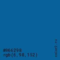 Цвет #066298 в цветовой модели RGB обозначается тремя октетами (6, 98, 152) в десятичном формате и #066298 в шестнадцатиричном (hex) формате, которые являются интенсивностью красного 6 (hex 06), интенсивность зелёного 98 (hex 62) и интенсивность синего 152 (hex 98).
