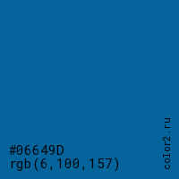 Цвет #06649D в цветовой модели RGB обозначается тремя октетами (6, 100, 157) в десятичном формате и #06649D в шестнадцатиричном (hex) формате, которые являются интенсивностью красного 6 (hex 06), интенсивность зелёного 100 (hex 64) и интенсивность синего 157 (hex 9D).