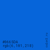 Цвет #0665DA в цветовой модели RGB обозначается тремя октетами (6, 101, 218) в десятичном формате и #0665DA в шестнадцатиричном (hex) формате, которые являются интенсивностью красного 6 (hex 06), интенсивность зелёного 101 (hex 65) и интенсивность синего 218 (hex DA).