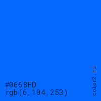 Цвет #0668FD в цветовой модели RGB обозначается тремя октетами (6, 104, 253) в десятичном формате и #0668FD в шестнадцатиричном (hex) формате, которые являются интенсивностью красного 6 (hex 06), интенсивность зелёного 104 (hex 68) и интенсивность синего 253 (hex FD).
