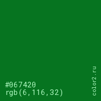 Цвет #067420 в цветовой модели RGB обозначается тремя октетами (6, 116, 32) в десятичном формате и #067420 в шестнадцатиричном (hex) формате, которые являются интенсивностью красного 6 (hex 06), интенсивность зелёного 116 (hex 74) и интенсивность синего 32 (hex 20).