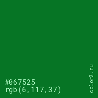 Цвет #067525 в цветовой модели RGB обозначается тремя октетами (6, 117, 37) в десятичном формате и #067525 в шестнадцатиричном (hex) формате, которые являются интенсивностью красного 6 (hex 06), интенсивность зелёного 117 (hex 75) и интенсивность синего 37 (hex 25).