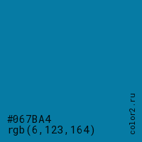Цвет #067BA4 в цветовой модели RGB обозначается тремя октетами (6, 123, 164) в десятичном формате и #067BA4 в шестнадцатиричном (hex) формате, которые являются интенсивностью красного 6 (hex 06), интенсивность зелёного 123 (hex 7B) и интенсивность синего 164 (hex A4).