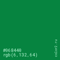 Цвет #068440 в цветовой модели RGB обозначается тремя октетами (6, 132, 64) в десятичном формате и #068440 в шестнадцатиричном (hex) формате, которые являются интенсивностью красного 6 (hex 06), интенсивность зелёного 132 (hex 84) и интенсивность синего 64 (hex 40).