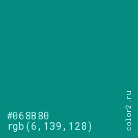 Цвет #068B80 в цветовой модели RGB обозначается тремя октетами (6, 139, 128) в десятичном формате и #068B80 в шестнадцатиричном (hex) формате, которые являются интенсивностью красного 6 (hex 06), интенсивность зелёного 139 (hex 8B) и интенсивность синего 128 (hex 80).