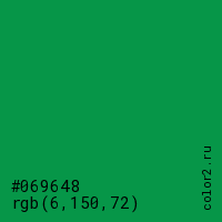 Цвет #069648 в цветовой модели RGB обозначается тремя октетами (6, 150, 72) в десятичном формате и #069648 в шестнадцатиричном (hex) формате, которые являются интенсивностью красного 6 (hex 06), интенсивность зелёного 150 (hex 96) и интенсивность синего 72 (hex 48).