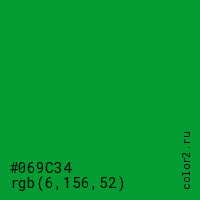 Цвет #069C34 в цветовой модели RGB обозначается тремя октетами (6, 156, 52) в десятичном формате и #069C34 в шестнадцатиричном (hex) формате, которые являются интенсивностью красного 6 (hex 06), интенсивность зелёного 156 (hex 9C) и интенсивность синего 52 (hex 34).