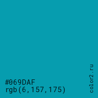 Цвет #069DAF в цветовой модели RGB обозначается тремя октетами (6, 157, 175) в десятичном формате и #069DAF в шестнадцатиричном (hex) формате, которые являются интенсивностью красного 6 (hex 06), интенсивность зелёного 157 (hex 9D) и интенсивность синего 175 (hex AF).