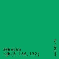 Цвет #06A666 в цветовой модели RGB обозначается тремя октетами (6, 166, 102) в десятичном формате и #06A666 в шестнадцатиричном (hex) формате, которые являются интенсивностью красного 6 (hex 06), интенсивность зелёного 166 (hex A6) и интенсивность синего 102 (hex 66).