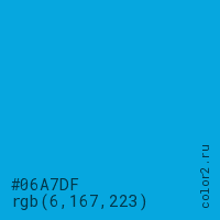 Цвет #06A7DF в цветовой модели RGB обозначается тремя октетами (6, 167, 223) в десятичном формате и #06A7DF в шестнадцатиричном (hex) формате, которые являются интенсивностью красного 6 (hex 06), интенсивность зелёного 167 (hex A7) и интенсивность синего 223 (hex DF).