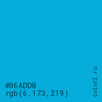 Цвет #06ADDB в цветовой модели RGB обозначается тремя октетами (6, 173, 219) в десятичном формате и #06ADDB в шестнадцатиричном (hex) формате, которые являются интенсивностью красного 6 (hex 06), интенсивность зелёного 173 (hex AD) и интенсивность синего 219 (hex DB).