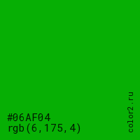 Цвет #06AF04 в цветовой модели RGB обозначается тремя октетами (6, 175, 4) в десятичном формате и #06AF04 в шестнадцатиричном (hex) формате, которые являются интенсивностью красного 6 (hex 06), интенсивность зелёного 175 (hex AF) и интенсивность синего 4 (hex 04).