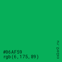 Цвет #06AF59 в цветовой модели RGB обозначается тремя октетами (6, 175, 89) в десятичном формате и #06AF59 в шестнадцатиричном (hex) формате, которые являются интенсивностью красного 6 (hex 06), интенсивность зелёного 175 (hex AF) и интенсивность синего 89 (hex 59).